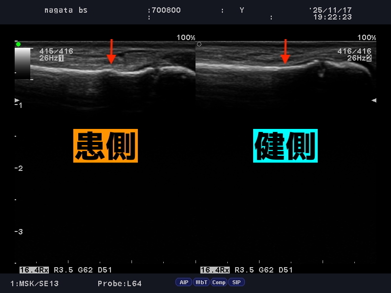 念の為エコーでも観察してみると、骨の不整像を確認いたしました。